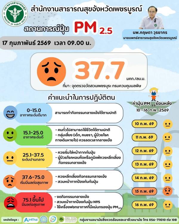 สำนักงานสาธารณสุขจังหวัดเพชรบูรณ์ รายงานสถานการณ์ค่าฝุ่นละอองขนาดเล็ก PM2.5 ประจำวันที่ 17 กุมภาพันธ์ 2569 เวลา 09.00 น. ค่าเฉลี่ย 24 ชั่วโมง ณ จุดตรวจวัดสวนเพชบุระ ตำบลในเมือง อำเภอเมืองเพชรบูรณ์ ตรวจวัดได้ 37.7 ไมโครกรัมต่อลูกบาศก์เมตร อยู่ในระดับคุณภาพอากาศ “เริ่มส่งผลกระทบต่อสุขภาพ” ตามเกณฑ์ดัชนีคุณภาพอากาศ