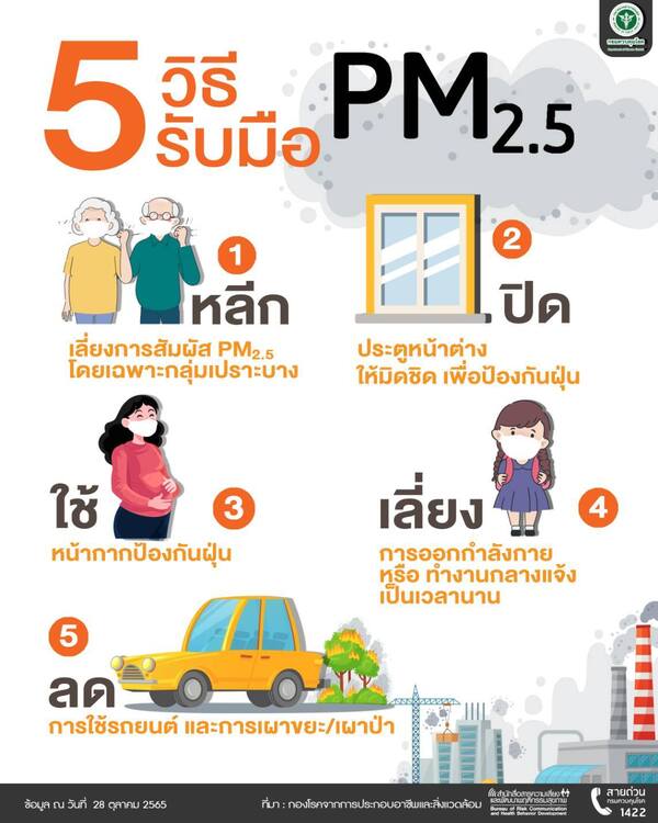 ทั้งนี้ สามารถติดตามข้อมูลดัชนีคุณภาพอากาศแบบเรียลไทม์ได้ที่เว็บไซต์ www.air4thai.com และประเมินความเสี่ยงจากการสัมผัสฝุ่น PM2.5 ผ่านแบบประเมินออนไลน์ของกรมอนามัย เพื่อป้องกันผลกระทบระยะสั้นและระยะยาว ซึ่งทางการแพทย์ระบุว่าฝุ่นขนาดเล็กสามารถเข้าสู่ถุงลมปอดและกระแสเลือด เพิ่มความเสี่ยงโรคหัวใจและหลอดเลือดได้