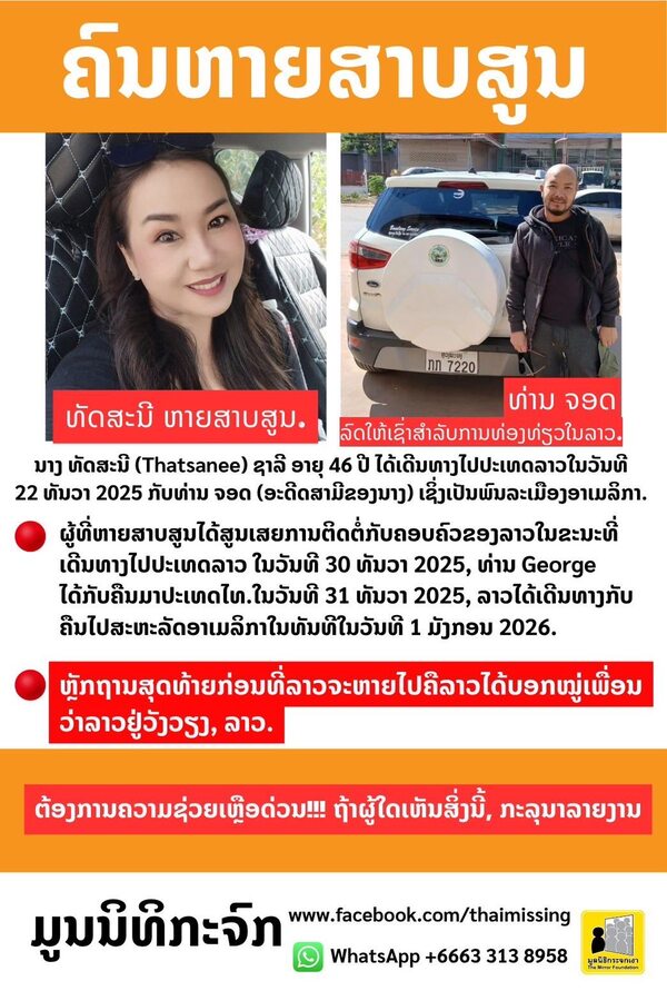 วันที่ 22 เมษายน 2569 ความคืบหน้ากรณี “คุณแอน ทัศนีย์” อายุ 46 ปี ชาวจังหวัดเพชรบูรณ์ หายตัวไปอย่างมีเงื่อนงำใน สปป.ลาว หลังเดินทางไปกับ “นายจอร์จ” อดีตสามีสัญชาติอเมริกัน โดย มูลนิธิกระจกเงา เปิดเผยข้อมูลพบพิรุธสำคัญหลายประเด็น จากการแกะรอยรถเช่าที่ทั้งสองใช้ พบว่าเมื่อเวลา 10.00 น. วันที่ 31 ธันวาคม 2568 ซึ่งเป็นช่วงที่ไม่สามารถติดต่อผู้สูญหายได้ ฝ่ายชายเดินทางเพียงลำพังไปยังโรงแรมแห่งหนึ่งในนครเวียงจันทน์ โดยไม่ได้เข้าพัก แต่กลับล้างทำความสะอาดรถก่อนเรียกบริษัทมารับคืน